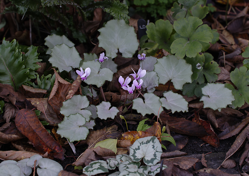 Ein paar Cyclamen pseudibericum zeigen schon ihr Blattwerk.