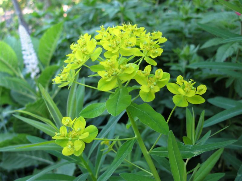 Das Knospenstadium zeigt bereits, dass diese Wolfsmilch wenig verzweigte Blütenstände bekommt. Allerdings sind die gelb gefärbten Hochblätter auffälliger als bei E, palustris u. Co.