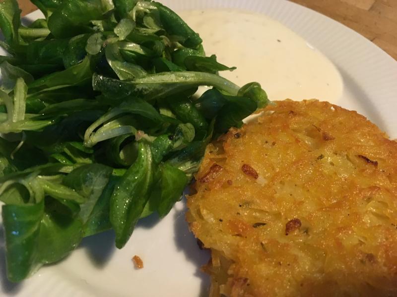 Erdäpfelpuffer mit Knoblauchjoghurt und Vogerlsalat