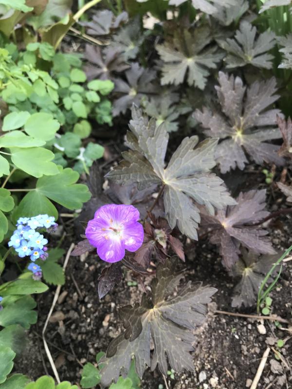 Als erster blüht dieses Jahr Geranium maculatum „Schokoprinz“.