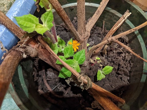 Mal ein aktuelles Bild meiner Yacon im Winterlager. Kaum ausgetrieben blüht das verrückte Ding auch schon wieder!