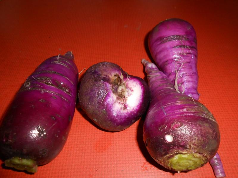 4 blaue Herbst- und Winterrettiche. Der eine hat eher Radieschenform.