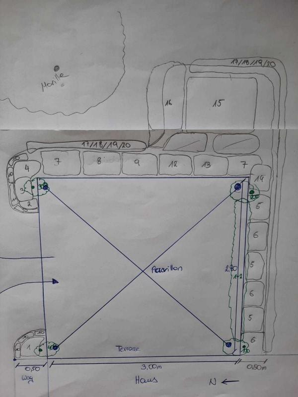 Ich habe nun meine Terrasse (3,0 x 2,8m) und den Pavillon (2,7m x 2,7m) darauf fertiggestellt und nun wird es Zeit für die entsprechende Bepflanzung :-)