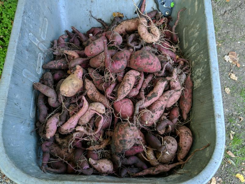 Bei mir ist am Wochenende auch die Süßkartoffelernte angestanden. Die Erträge waren okay, allerdings sind mir die Knollen im Vergleich zu den Vorjahren eher klein vorgekommen. Insgesamt hätte es wohl mehr sein können, aber für ein Jahr wird es reichen.
