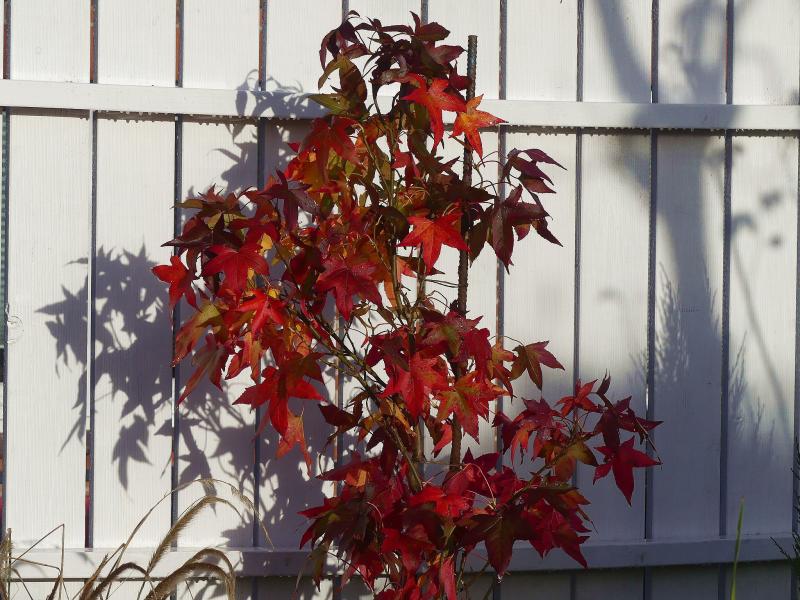 Hier färbt jetzt so richtig der noch junge Liquidambar styraciflua 'Slender Silhouette'