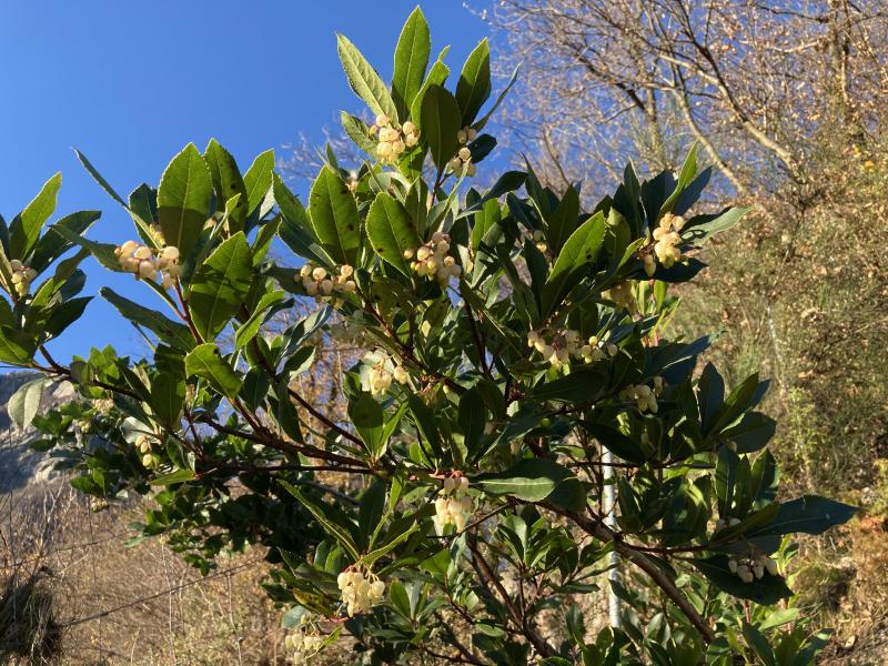 Auch der Arbutus unedo schmückt sich mit kleinen Trauben von Blüten.