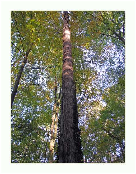Manchmal führt mich mein Weg auch durch lichte Wäldchen.In diesem Forst gibt es einen wunderschönen alten Baumbestand mit riesigen Bäumen, die geradewegs in den Himmel zu wachsen scheinen. Hin und wieder war das Klopfen eines Spechtes zu hören. Gezeigt hat sich leider keiner. Ansonsten absolute Stille.