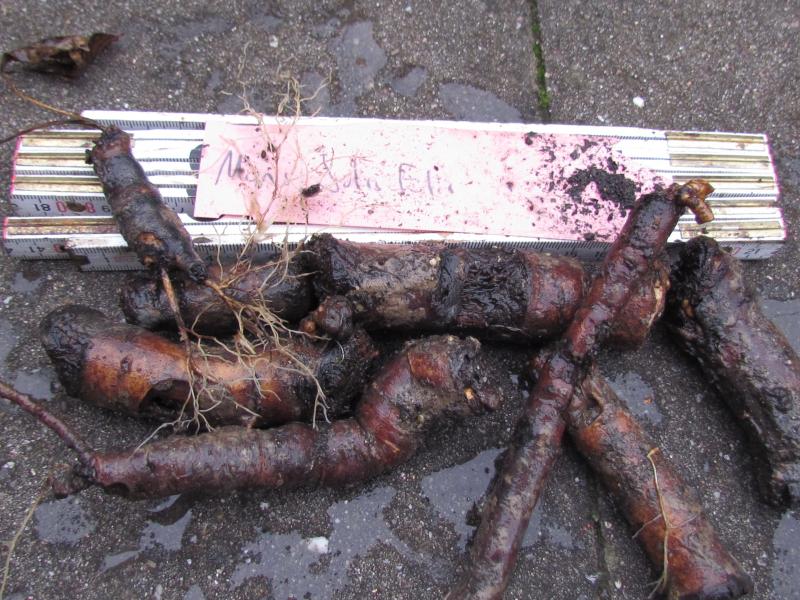 Allerdings haben viele Wurzeln von `Monsineur Jules Elie´ gar nichts oder nur ein bisschen Kallus, aber kein Auge, gebildet. Ein Winzteil hatte wohl im Frühling genug Energie zum Austrieb, aber für eine Auge hats da auch nicht gereicht.