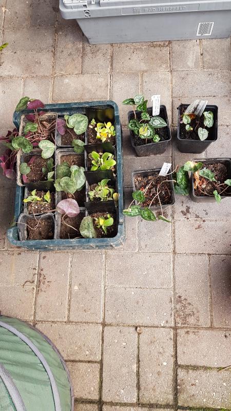 Auf dem Foto eine Auswahl der ertauschte/geschenkten Cyclamen und Aurikeln. Nicht zu sehen: Iris, Rhodohypoxis und einiges mehr.
