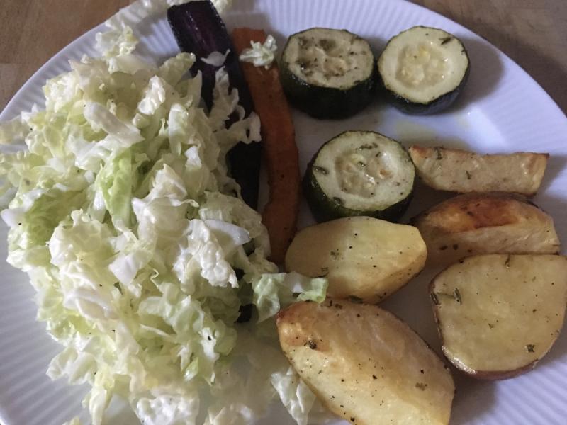 Hier gabs Ofengemüse (Erdäpfel, Karotten, Zucchini) mit Chinakohlsalat