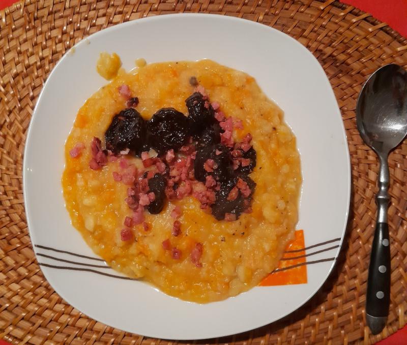 Hier gab es heute Tüften un Plum (für die Nichtmecklenburger: Kartoffeln und Pflaumen). Im Prinzip ist das ein Eintopf aus Zwiebeln, Sellerie, Kartoffeln und Möhren (alles angeröstet), mit Gemüsebrühe grade so bedeckt und durchgeköchelt, grob gestampft und dabei etwas Sahne eingearbeitet. Salz und Pfeffer nach Geschmack. Ins Originalrezept gehören noch Kasslerscheiben, die habe ich weggelassen (unter der Woche essen wir fleischarm). Dafür habe ich reichlich Schinkenwürfel angeröstet und mit eingeweichten Backpflaumen angebraten. Die kommen dann oben auf den Eintopf drauf, und alles zusammen schmeckt überraschend lecker. Die Süße der Pflaumen stört in keiner Weise.