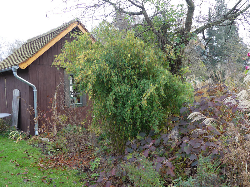 Was die Sitution am Gartenhäuschen angeht: Der Blick soll schon frei bleiben, es soll kein hohes Gehölz dort hin. Aber was mir am Bambus bisher gefiel: Das Grün auch in der kalten Jahreszeit. Das war für mich bisher immer sehr passend. Daher ist der erste Reflex auch gewesen, dass in dieses Beet wieder etwas immergrünes soll. Hinter und neben dem Gartenhaus stehen ja (noch) diverse Buchse, die das fortsetzen. Ich muss da nochmal in mich gehen.