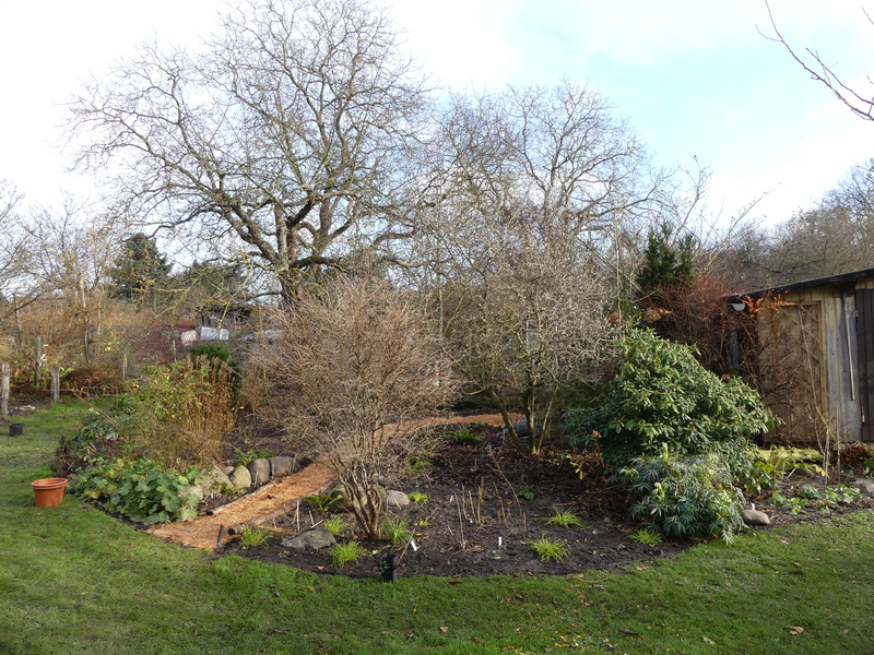 Mein erstes Bild vor dem geistigen Auge war halt ein maximal brusthoher Rhododendron, der die Lücke füllen könnte. Je öfter ich dran vorbeigehe, desto mehr gewöhne ich mich an den Anblick. Vielleicht nehme ich doch den sommergrünen Rhodo und/oder eine Strauchpäonie dazu. Eine P. suffruticosa steht schon auf der anderen Beetseite.
