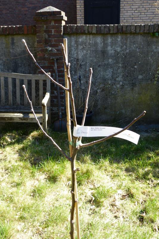Meine Idee war/ist, den Apfel als Spindel (an einer Hauswand) zu ziehen. Hierzu wollte ich ihn auf gut 1m hochasten, um die schwachwüchsigen Maibeerensorten (Aurora und Tomiczka) als Unterpflanzung zu belassen. Leider ist der Mitteltrieb bei 1m gekappt worden (zwei Leittriebe ebenfalls). Der erste kleine Leittrieb geht bei 60cm ab. Meine Idee jetzt ist, den rel. schwachen obersten linken als neuen Mitteltrieb zu ziehen.
