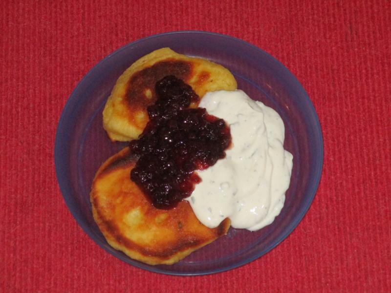 Quarkkeulchen. Und da mir heute nicht so nach nur-süß war, gab es außer den Preiselbeeren auch noch eine Kräuter-Quark-Soße dazu.