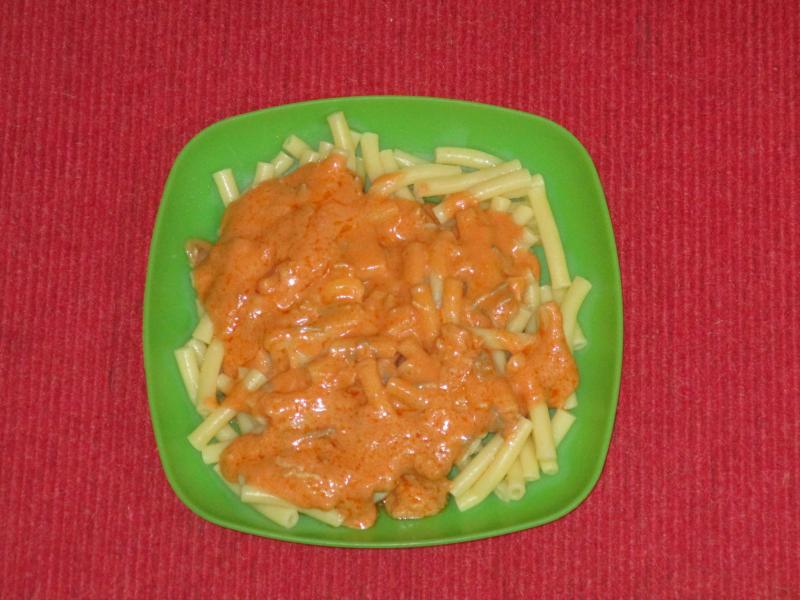 Hier gab es heute Mittag Maccaroni mit Blauschimmelkäsesoße + einem kläglichen Rest passierte Tomaten.