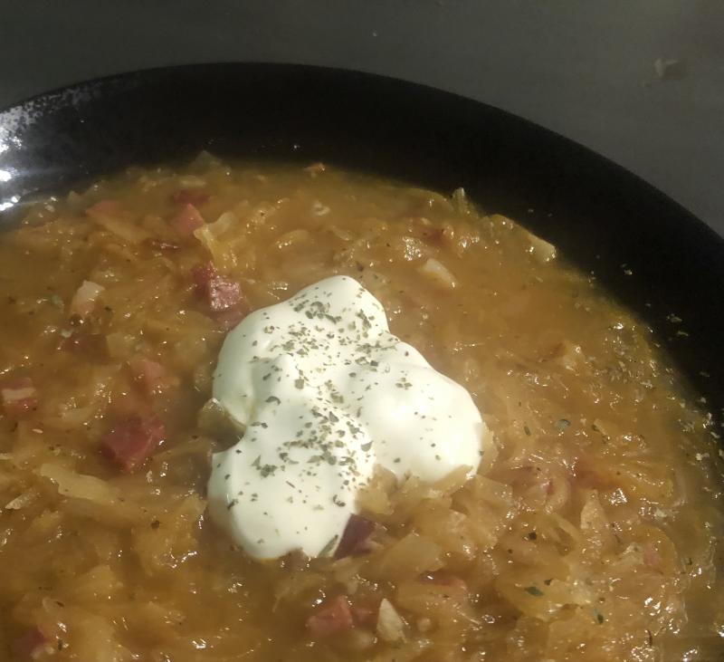 Weil Thomas heute (nach dem Booster gestern) etwas angeschlagen ist, gab es heute ein Alternativgericht angeregt durch Martina. Wir hatten noch Sauerkraut, Hühnerbrühe, sehr stark eingekochte Tomatensugo und die restliche Zutaten aus diesem Rezept waren auch da - es hat gemundet! ;) :D