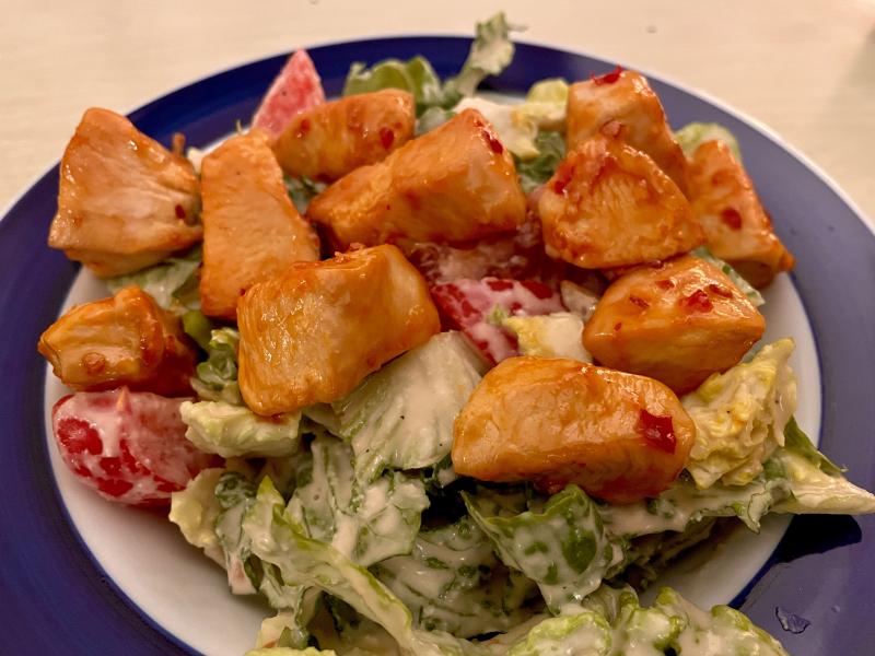 schnelle küche: caesar salad mit gebratener hühnerbrust aber ohne croutons und parmesanspäne, dafür etwas geriebenen parmesan zusätzlich untergehoben