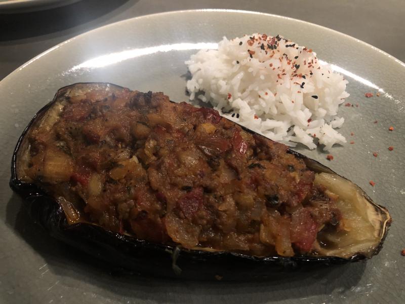 Wir haben heute nach diesem Rezept gekocht. Aber bevor ich die Auberginen gefüllt habe, habe ich kräftig nachgewürzt. Und zwar mit Türlü Baharat, Pul Biber, Kreuzkümmel und Chili.