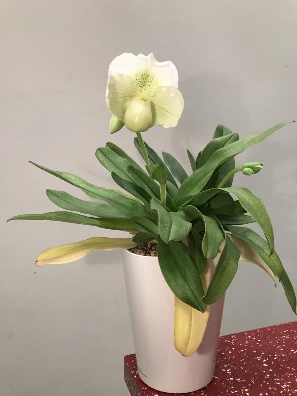 Eine entzückende Naturform, die zu einer besonderen Gruppe der Paphiopedilum gehört, den "Revolverblühern", die zwar mehrblütig sind aber bei denen sich die Blüten eine nach der anderen öffnen.