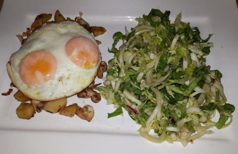 Da ich einen ganzen Saibling hatte, wurde er nur mehliert und mit S&P gewürzt. Und um ein halbwegs ansehnliches Photo zu bekommen, wurden zwei Teller benutzt/zwei Photos gemacht. ;)