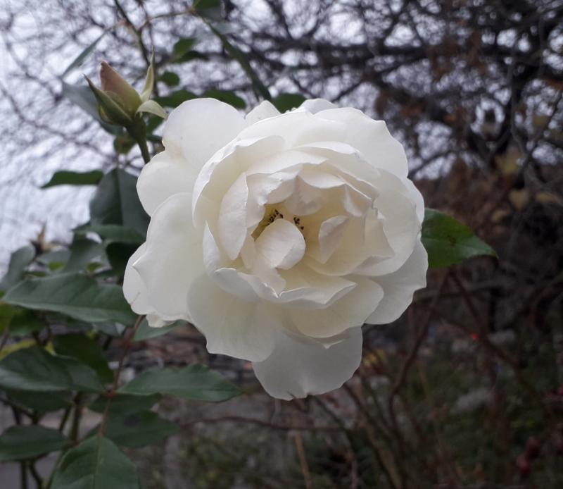 Unterwegs fallen mir seit Jahren, immer als "sicherer Winterblüher", mehrere Stöcke weißer Rosen auf. Denke es ist jeweils dieselbe, dummerweise habe ich noch nie während des Sommers auf sie geachtet. Die Pflanzen sind jetzt freilich wenig belaubt, aber teils noch voller Blüten. In aller Regel rein weiß, manchmal mit etwas morbidrosa Flush. Höhe je nachdem, ein bis über zwei Meter, der Wuchs wirkt auf mich eigentlich ziemlich "harmonisch".