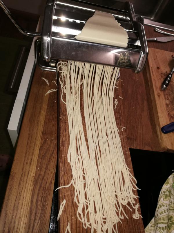 Nächstes mal werden die Nudeln auf Vorrat produziert und aufgehängt oder in Mehl bestäubt gelagert und erst dann in größeren Mengen abgekocht ...