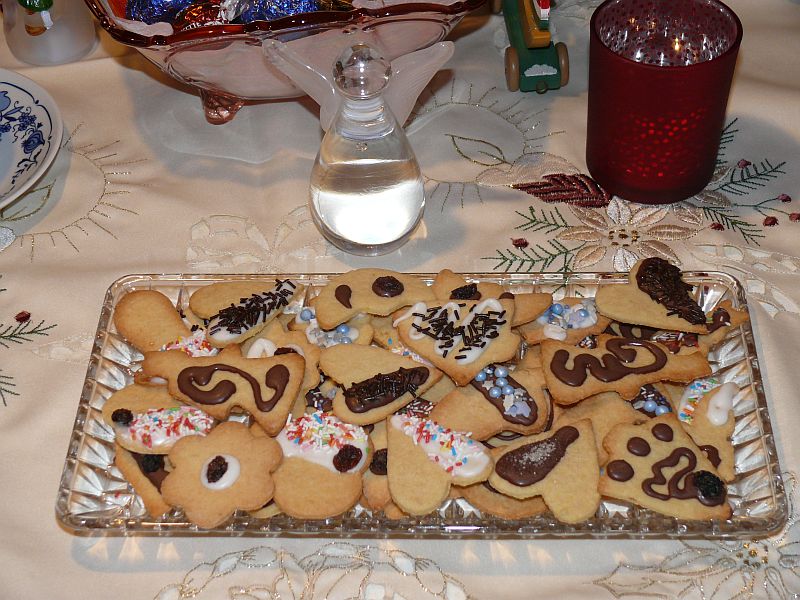 Am liebsten mochte ich die Spitzbuben, die immer einzeln in Seidenpapier verpackt waren. Die selbstgemachte Himbeermarmelade aus dem Garten wurde extra dazu gepackt, die Plätzchen wurden erst unmittelbar vor dem Genuss mit der Marmelade zusammengesetzt, damit sie knusprig/mürbe blieben.