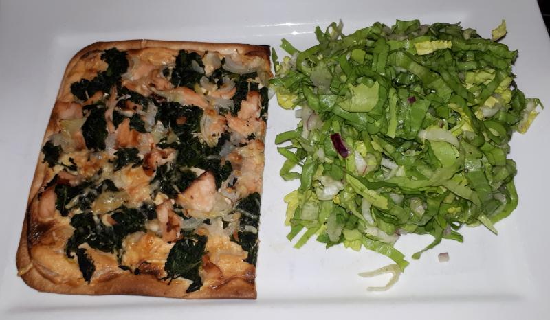 Flammkuchen mit Spinat, Zwiebeln und Lachs, Endiviensalat
