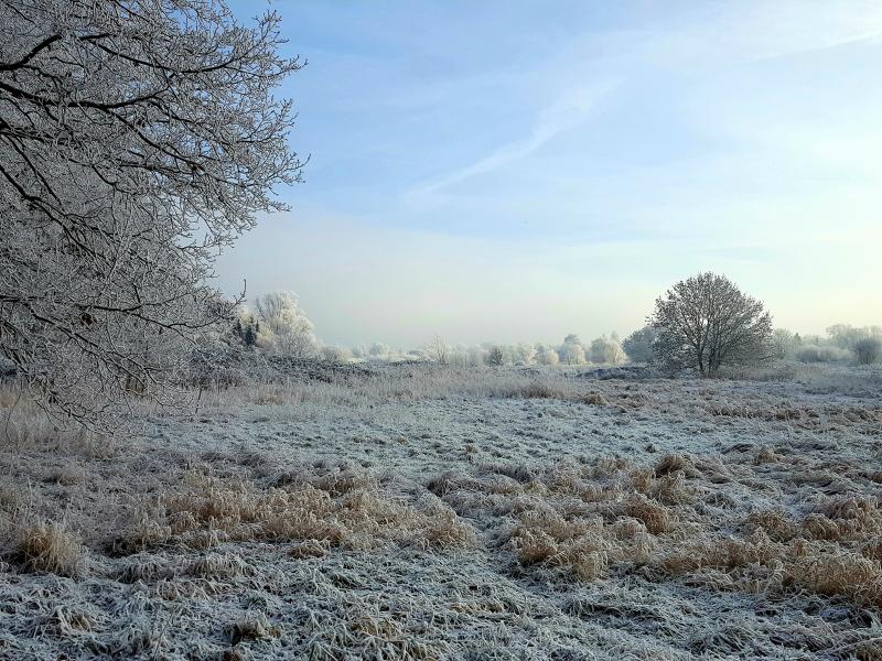Beraureifte Lesumniederung im Vordergrund, hinten sonnenbeschienene Baumreihe.