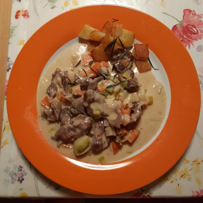 Vorgestern gab es hier Hähnchenmägen mit Suppengemüse in Cognacsahne.
