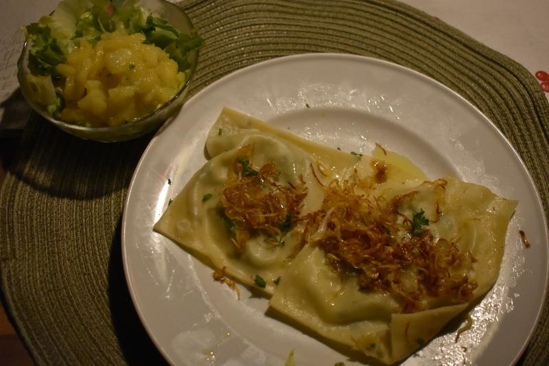 Morgen gibt es selbstgemachte Maultaschen, die eine Zwiebelschmelze bekommen mit Kartoffel- und Endiviensalat.