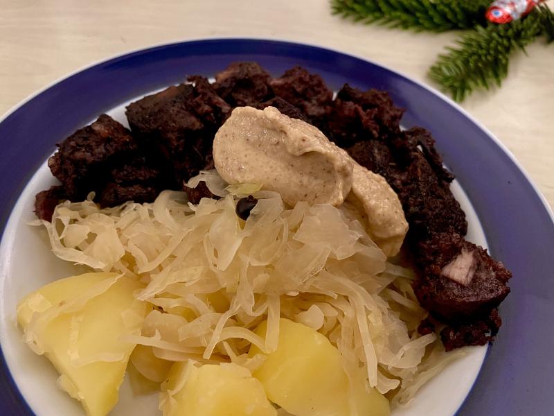 Gestern gab es traditionell Kartoffelsalat mit Würstchen. Heute Hirschgulasch mit Rotkohl.