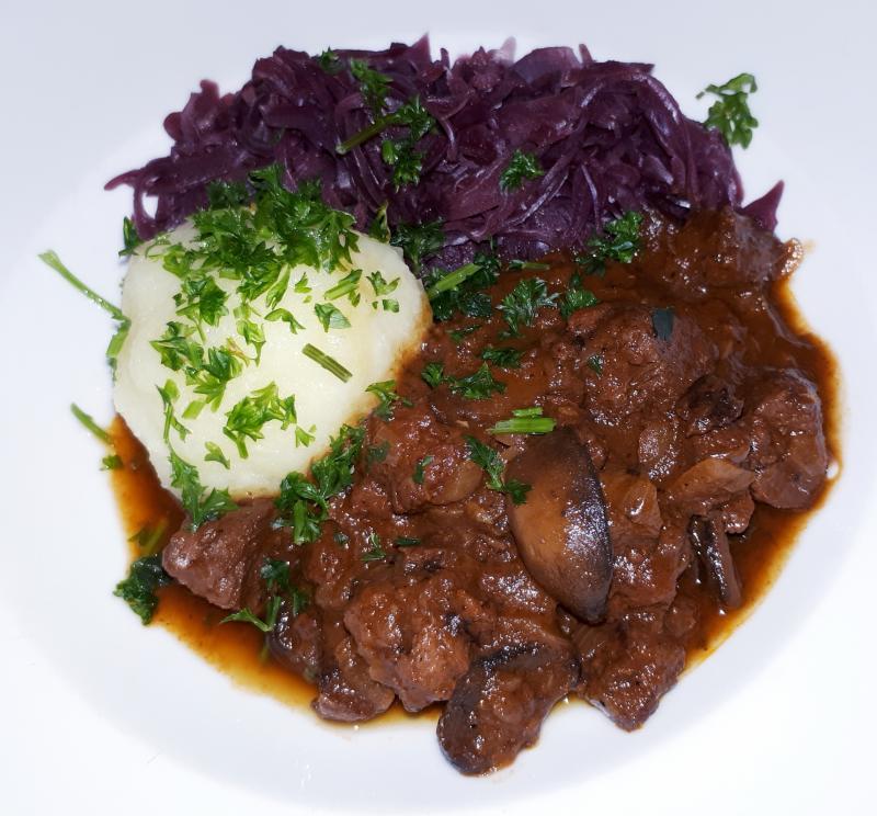 Rotkohl, rohe Klöße und veganes Gulasch mit Champignons und viel Zwiebeln, grüner Salat