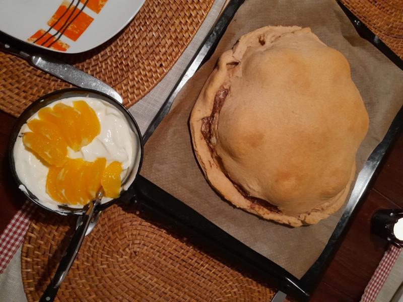 Heute gab es noch einmal Ente, als Dessert Crepes mit Spekulatius-Marzipan-Quarkfüllung , Bratapfelkompott und Glühweinsirup.