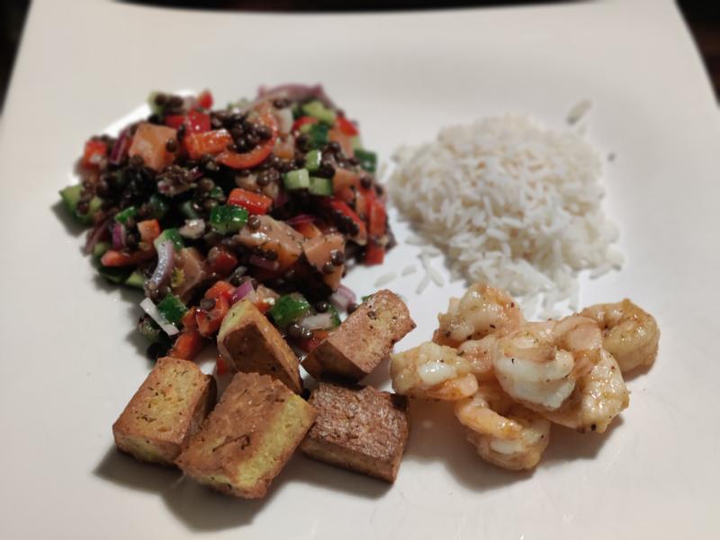Lecker! Hier gab es heute auch ein wenig durcheinander. Linsensalat mit Lachs, gebratene Garnelen und gebratener Panir, dazu noch Reis.