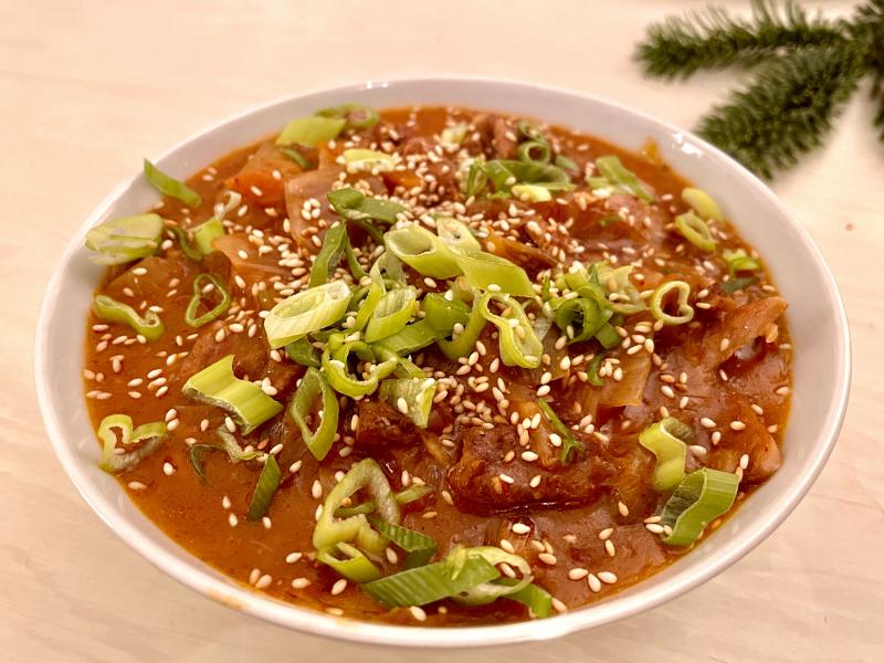 letztendlich wurde daraus ein ungewöhnlich schmeichelndes kimchi-jjigae, das carrageen war auffallend dominant. 8) ;) :D