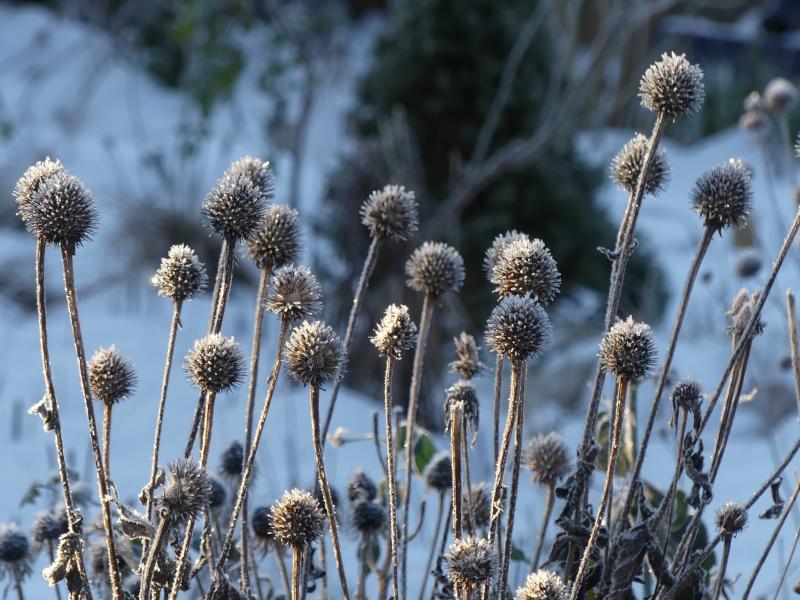 Auf der anderen Hausseite habe ich einen Blick zum Ort hin und rechts zur Koppel und den Waldrand.Die Kinder hatten Schneemänner gebaut.
