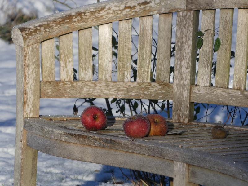 Was für ein herrliches Winterwunderland! :D Schnee und Sonnenschein, die filigranen Strukturen der Gräser und Stauden, die hell erleuchtete Kulisse der Bäume rundherum, da kann einen die Kälte kaum schrecken, eine extralange Fotorunde zu drehen. ;) Nun kommt auch die Größe des Gartens und die weite Landschaft rundherum zur Geltung, während der üppige Bewuchs im Sommer überall geschützte Räume schafft. Nur noch die gefrosteten Rosenblüten lassen einen Hauch der wärmeren Jahreszeit verspüren und zaubern kleine Stillleben vor die Kamera.