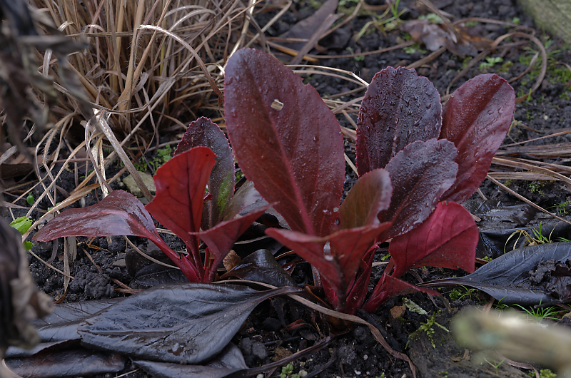 gute Idee! Wirklich gute Idee? Bergenien verdrängen doch alles, oder? Aber ich kann das ja mal machen, die ganzen edlen Sorten mit dunklem rotem Laub einfach unter die Winterblüte. Das bringt möglicherweise was Struktur und Ordnung rein.