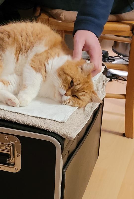 Lieblingsplatz ist eigentlich derzeit Dosis Stuhl,aber notfalls tut es auch seine Aktentransportkiste.