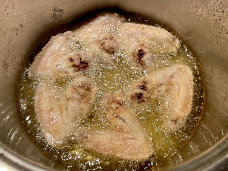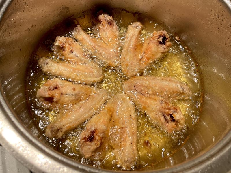 gestern gab es bei uns höchst ungesundes in anlehnung an ein unterhaltsames double fried korean chicken-rezept, allerdings ohne die typische koreanische würzsoße, zur beschleunigung und gg-seitig erwünschten würzreduzierung gab es süße chilisoße aus der flasche.