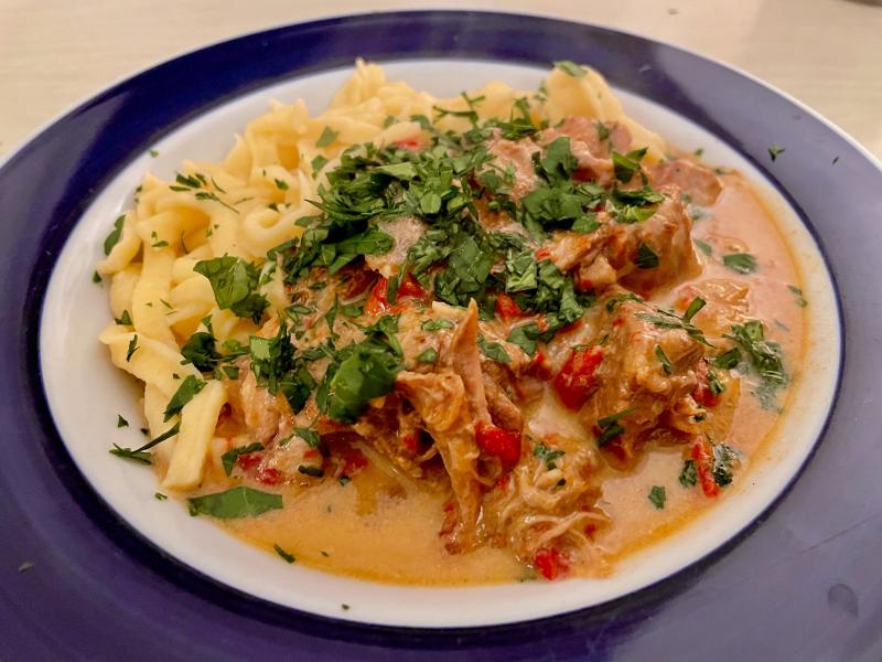 rahmgulasch vom bioschwein mit convenience-spätzle
