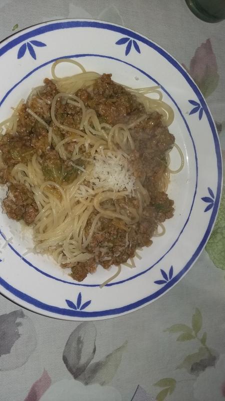Heute ebenfalls ein schnelles Essen: Spaghetti mit einer Hack-Wirsingpfanne mit Parmesan.