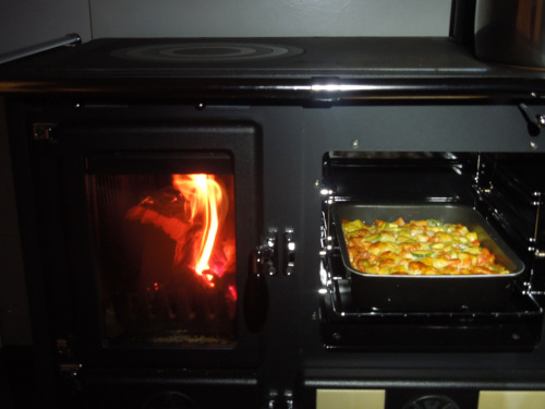 Der Holzherd wird ausschließlich mit Holz betrieben. Einen Elektrobackofen und Ceranfeld habe ich zusätzlich. Mit der Küchenhexe soll überwiegend gekocht/gebacken werden, wenn auch Heizwärme benötigt wird (oder wenn der Strom ausfällt :D). Wenn nur ein Holzscheit nach dem anderen verbrannt wird, macht das schon eine Heizleistung von ca. 4 kW.