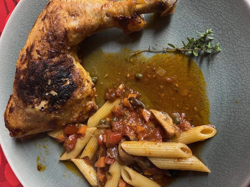 Wir haben zu Weihnachten ein neues Buch erworben: Das ganze Huhn. Rezepte zur Verwertung von allem, was ein Huhn hergibt. Heute ein erstes Gericht gekocht, erinnert etwas an italienische Küche: Hühnchenschenkel geschmort mit Tomaten, etwas Chili und Knoblauch, Oliven und Kapern. - Penne für die leckere Sauce. - Hmmm ...