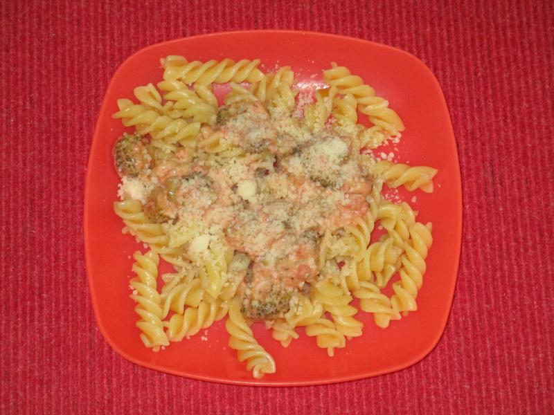 Spirellen mit Tomatensoße (mit Broccoli und Knobi).
