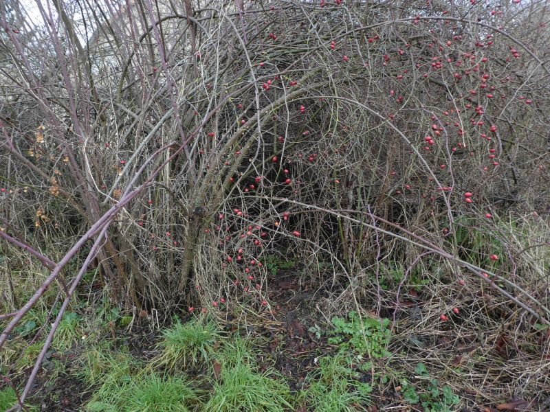 Ein ernst gemeinter Vorschlag: könntest du nich die gesamte Rose bodennah zurück schneiden, "den Haufen" bis zum frühen Frühjahr liegen lassen und rechtzeitig vor der Brutzeit schreddern?