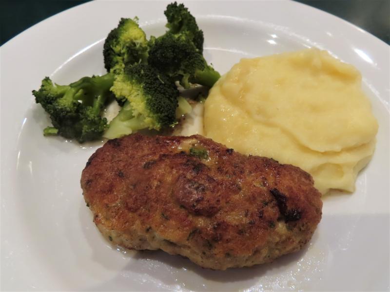 Und heute Hühnerbutterschnitzl (Kapern, Senf, Zitzonenschale) mit Erdäpflpetersilwurzelpüree und Brokkoli.