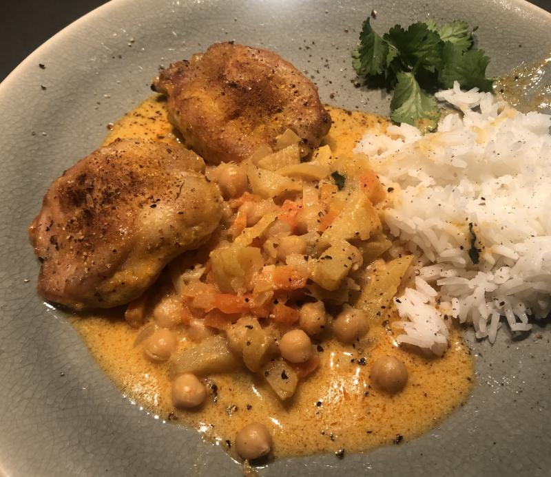 Erst Thunfisch und Avokadotartar mit Salat und Ketakaviar und dann Gedünstete Wachtelbrüste mit Kichererbsen, Apfel und Curry. Die TK-Wachtelbrüste mußten alle auf einmal aufgetaut werden. Deshalb vorgestern und gestern Wachtelbrüste. Das Rezept war auch aus dem neuen Hühner bzw Geflügelkochbuch. Erst wird das Curry zubereitet und dann werden die Wachtelbrüste mit S+P+Curry gewürzt und auf das Curry gelegt. Das Ganze dann für 20 Minuten in den Ofen. Geniales Verfahren - ohne anbraten hat man saftiges Fleisch und eine krosse Kruste.